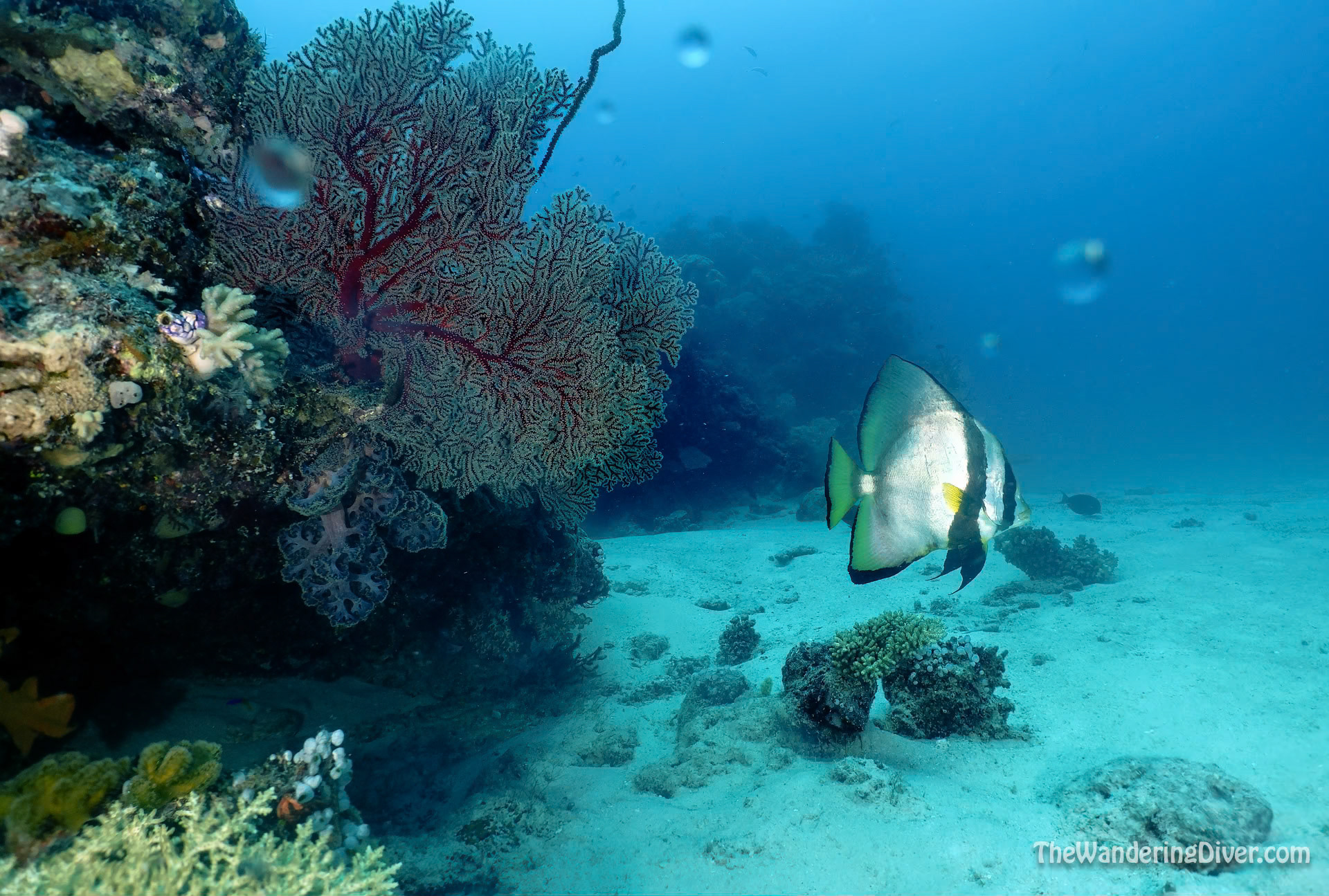 A couple of batfish swim around the deck of the shipwreck Molas off Manado.